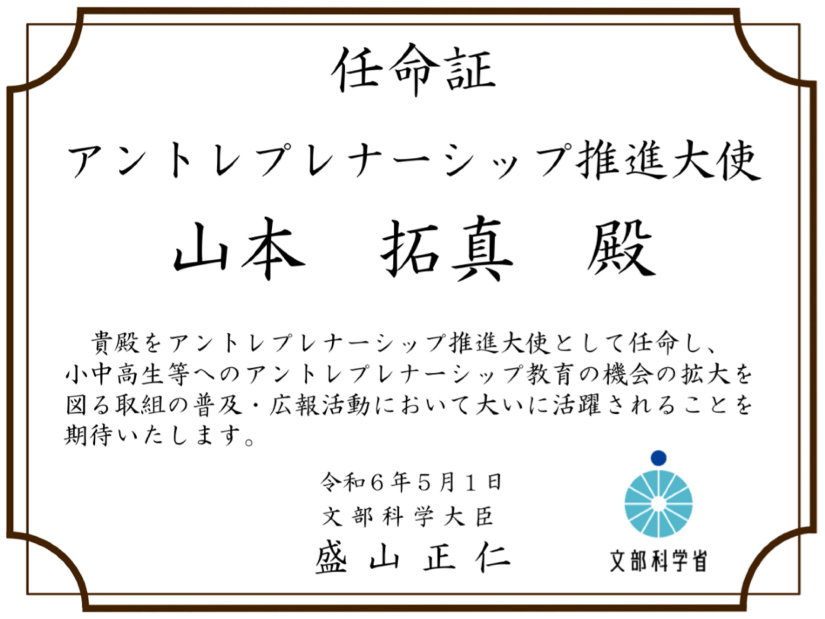 このようなアントレプレナーシップ教育を推進する機運を全国的に高めるため、令和5年1月に「起業家教育推進大使」が任命され、今年、令和6年4月から「アントレプレナーシップ推進大使※」へと刷新し、弊社山本が任命を受けました。推進大使は、それぞれの経験やネットワーク等を活かし、全国的なイベントや学校現場などで授業・講演等に協力してまいります。